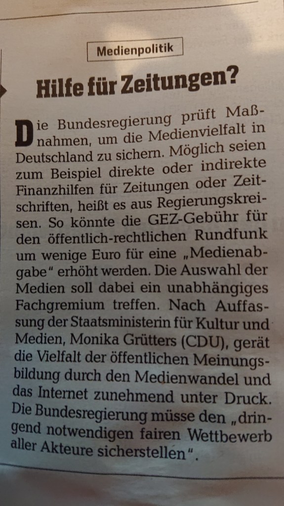 Som en der kender det tyske medielandskab ganske godt kan jeg sige at et sådant tiltag i sidste ende IKKE vil bidrage til at gøre det tyske medielandskab mere pluralistisk, men derimod ende med at betyde at medier der takket være deres ræverøde regime-tro journalistiske kurs aktuelt styrtbløder læsere vil få kunstigt åndedræt på dødslejet fordi de ses som nyttige for regimet.
